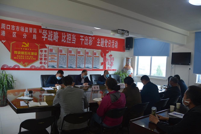 党委书记、局长崔健强调,全体党员干部利用这次活动抓好抓实学习教育,一要学战略,积极作为。全体同志要认真学习河南“十大战略”系列专题讲座,贯彻落实省委、市委关于实施“十大战略”的部署要求,履行市场监管部门职责职能,更好融入港区充分发挥“周口港通江达海内河航运独特优势,全力以赴做大做强临港经济”战略布局,积极作为。二要比担当,求真务实。国之大者,局之大者,担当为要。全局党员干部要围绕“临港新城,开放前沿”目标,在服务临港经济高质量发展中,勇于担当挑大梁,按照市委书记张建慧在中心城区“五区”重点工作推进会上的要求,以新的发展定位,引领中心城区“起高峰”。三要干出彩,争先创优。围绕“十大战略”,结合临港经济发展特点和市场监管实际,大力实施质量强区、食品药品安全、知识产权创新、广告发展等具体举措,实现战略实施与履行职能具体化、融合化,以项目制、目标制、考核制、量化制“四制化”推动工作,遵循“单项工作争第一、整体工作上台阶”和“保三争一”的目标,巩固好、推进好、提升好,强化抓好重点工作目标,有力推进量化考核达标争优。以“能力作风建设年”为抓手,提升业务能力、执法能力、监管能力、服务能力、维权能力,确保各项工作有力有效开展。在“学战略、比担当、干出彩”活动中,有作为、有成效、有责任、有奉献,在服务临港经济高质量发展的新赶考路上,做到政治担当、知责尽责、奋力有为,为迎接党的二十大胜利召开贡献市场监管力量。